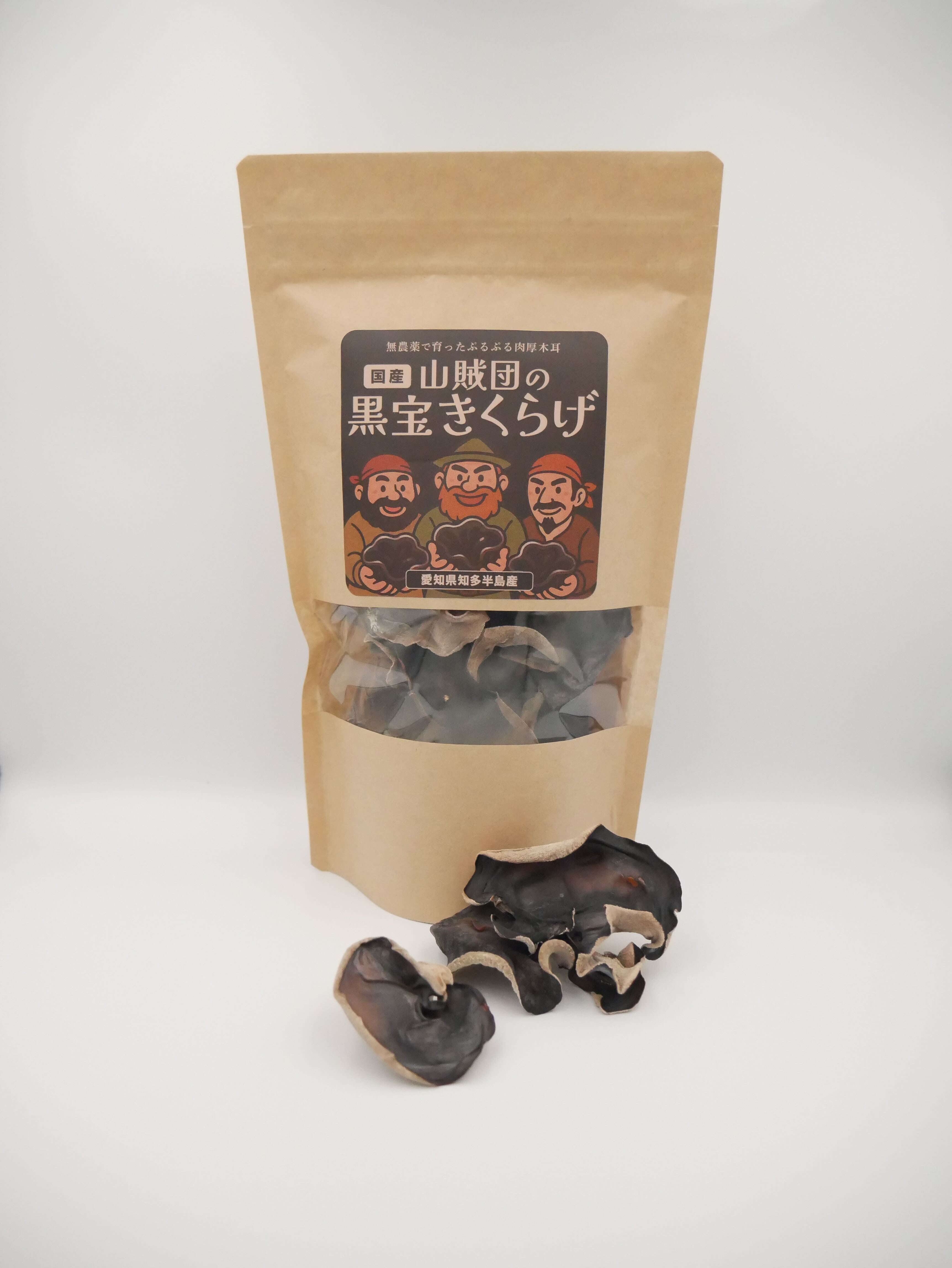 「山賊団の黒宝きくらげ」は、愛知県知多半島で丁寧に育て上げた、肉厚でぷりぷり食感が自慢の国産きくらげです。